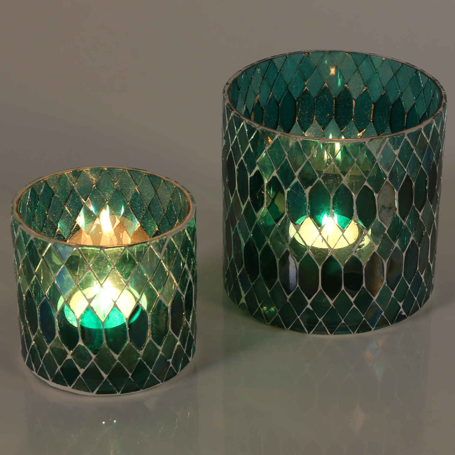 Dekoratives Mosaik Glas-Windlicht, Teelichthalter. Die bunten Gläser sind außen mit kleinen Mosaik-Glassteinchen von Hand beschmückt, dadurch ist jedes Mosaik Glaswindlicht ein Unikat. Egal ob im Wohnzimmer als Tischdeko, auf der Terrasse als Gartenwindlicht, oder im Schlafzimmer als Stimmungslicht, oder als Kerzenständer in Ihrem Restaurant, Hotel, oder Lounge - die Mosaik-Windlichter sorgen immer für eine stimmungsvolle Atmosphäre und avancieren zum Deko-Highlight, dem sich keiner entziehen kann.