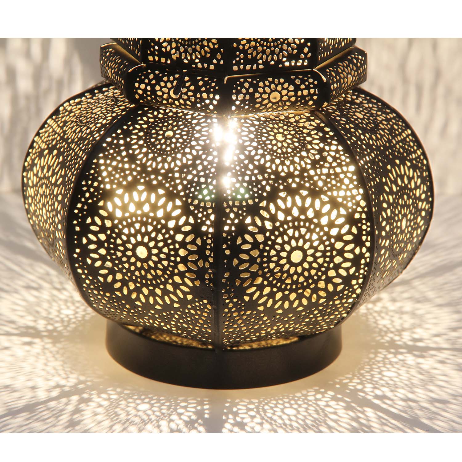 Unsere Tischlampe Asif ist eine wunderschöne orientalische Lampe, welche sorgsam von Hand gefertigt wurde! Ihre traumhaften Muster und Schattenspiele verzaubern jeden Raum. Die Bodenlampe ist in von innen in Antik-Gold-Look und außen ist diese in schwarz lackiert.