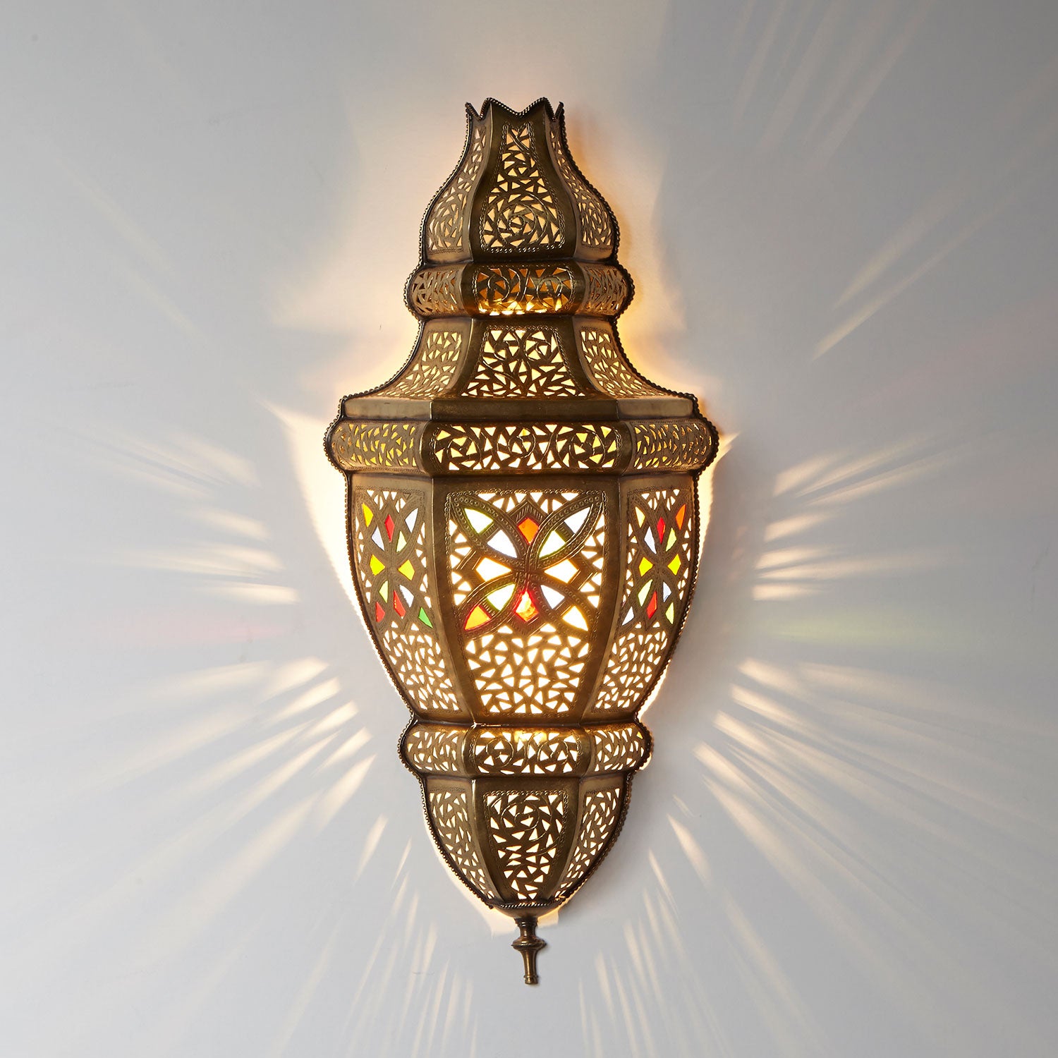 Marokkanische Wandlampe aus reinem Messing kunstvoll und sehr aufwändig verarbeitet. In kunstvoller Handarbeit wurde die Lampe fein geformt und mittels Techniken wie Ausschnitt oder Gravur mit filigranen, orientalischen Ornamenten verziert und anschließend mit bunten Glaseinsätzen ausgeschmückt. Die bunten Glasscheiben der Messinglampe lassen das Licht durchblicken und verleihen ihr somit einen märchenhaften Charakter.