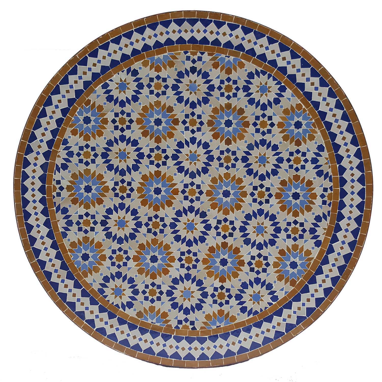 Beim Esstisch Ankabut Braun sind die Fugen zwischen den einzelnen Mosaikstücken gut sichtbar. Das ist durchaus gewollt, denn die Handwerker hatten bei der Gestaltung das kunstvoll gewobene Netz einer Spinne (Ankabut) vor Augen. Alternativ erinnert das Design an ein Feuerwerk oder ein Beet, wie es Blumenfreunde lieben. Bei den Farben hat der Mosaikleger dezente Nuancen von Blau und Ocker gewählt.