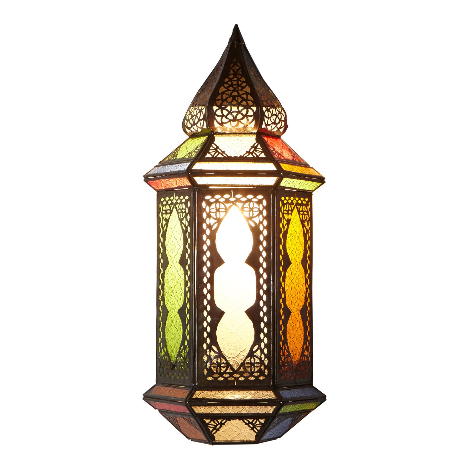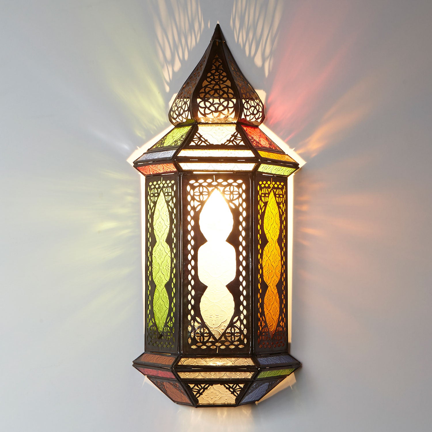 Orientalische Wandlampe aus Dunkelbraunem Metall mit mit kunstvoll eingearbeiteten Glas-Einsätzen aus Reliefglas. Ein Kunsthandwerk aus Marrakesch / Marokko. Durch die in das Eisen eingearbeiteten Muster entsteht ein Faszinierendes Licht- Schatten-Effekt.