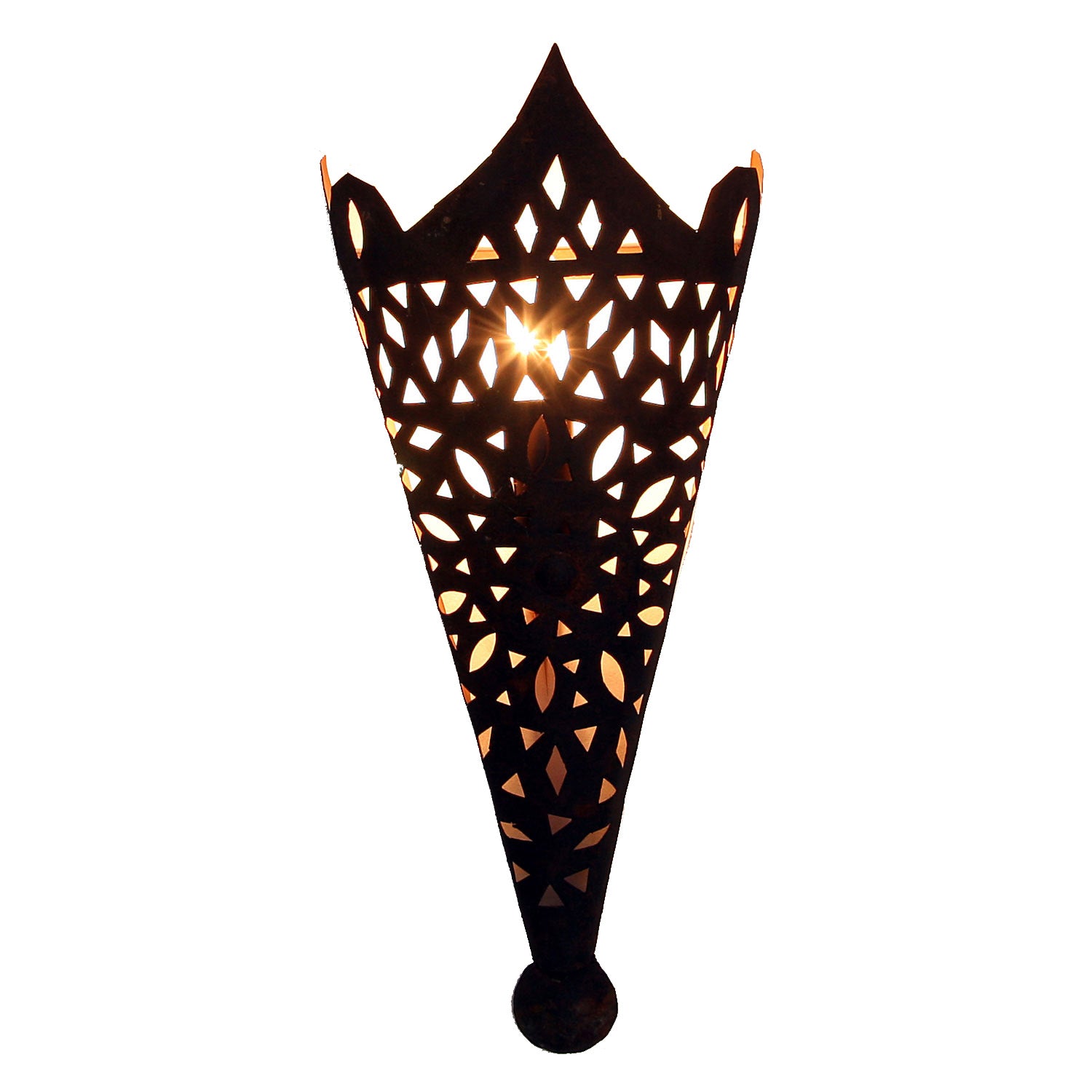In reiner Handarbeit wurden mit Hammer und Meißel filigrane, orientalische Ornamente und Ausschnitte in das eiserne Metallgerüst eingearbeitet. Die ausgestanzten Muster werfen mystische Schatten und tragen zur Gemütlichkeit bei. Um einen optimalen Schattenwurf zu erzielen empfiehlt es sich bei Eisenlampen dieser Art klare Glühbirnen zu verwenden. Nur für elektrische Beleuchtung geeignet.
