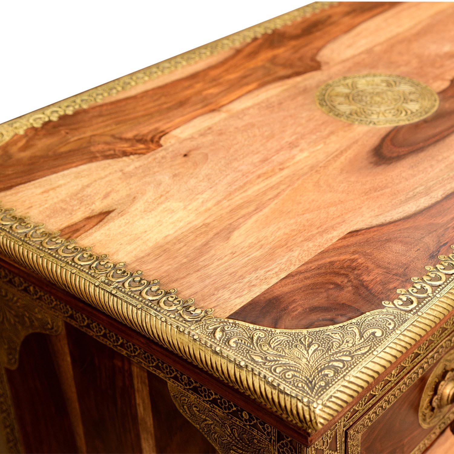 Unsere indische Kommode Malek besteht aus Sheeshamholz und wurde in hochwertiger Handarbeit hergestellt. Die Kombination aus der ruhigen rotbraunen Farbe des Sheeshamholzes und den verzierten Metallelementen harmonisieren besonders gut miteinander!
