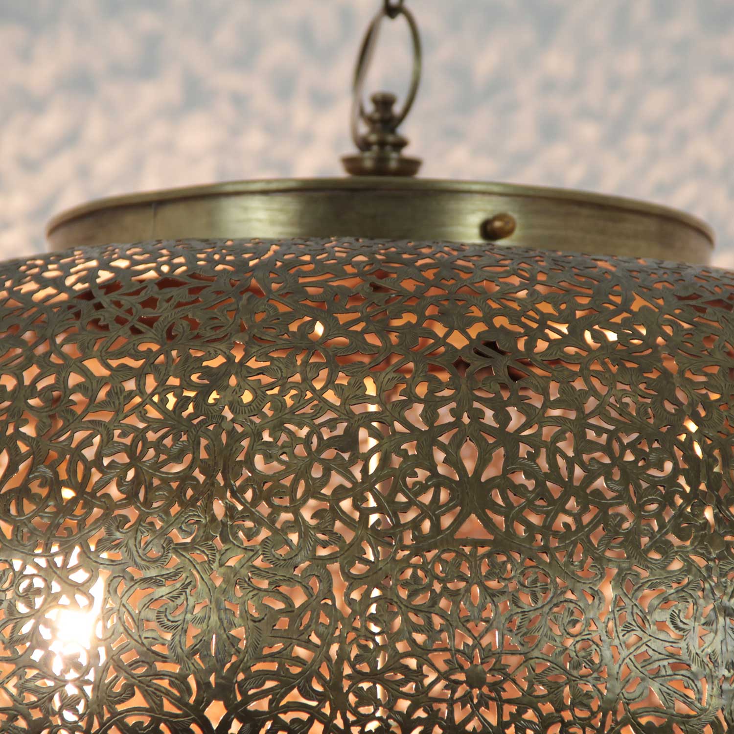 Neu im Sortiment! Das Non plus Ultra unter unseren orientalischen Lampen. Ihr unvergleichliches Design aus dunkel-goldfarbenem, reinem Messing ist ein Luxuskult des Orients. Das Lampenmuster ist von Hand eingesägt und die filigranen Blattmuster in aufwändiger Handgravur gefertigt. Hier trifft die Moderne auf den Orient und besticht durch ihre Einzigartigkeit.