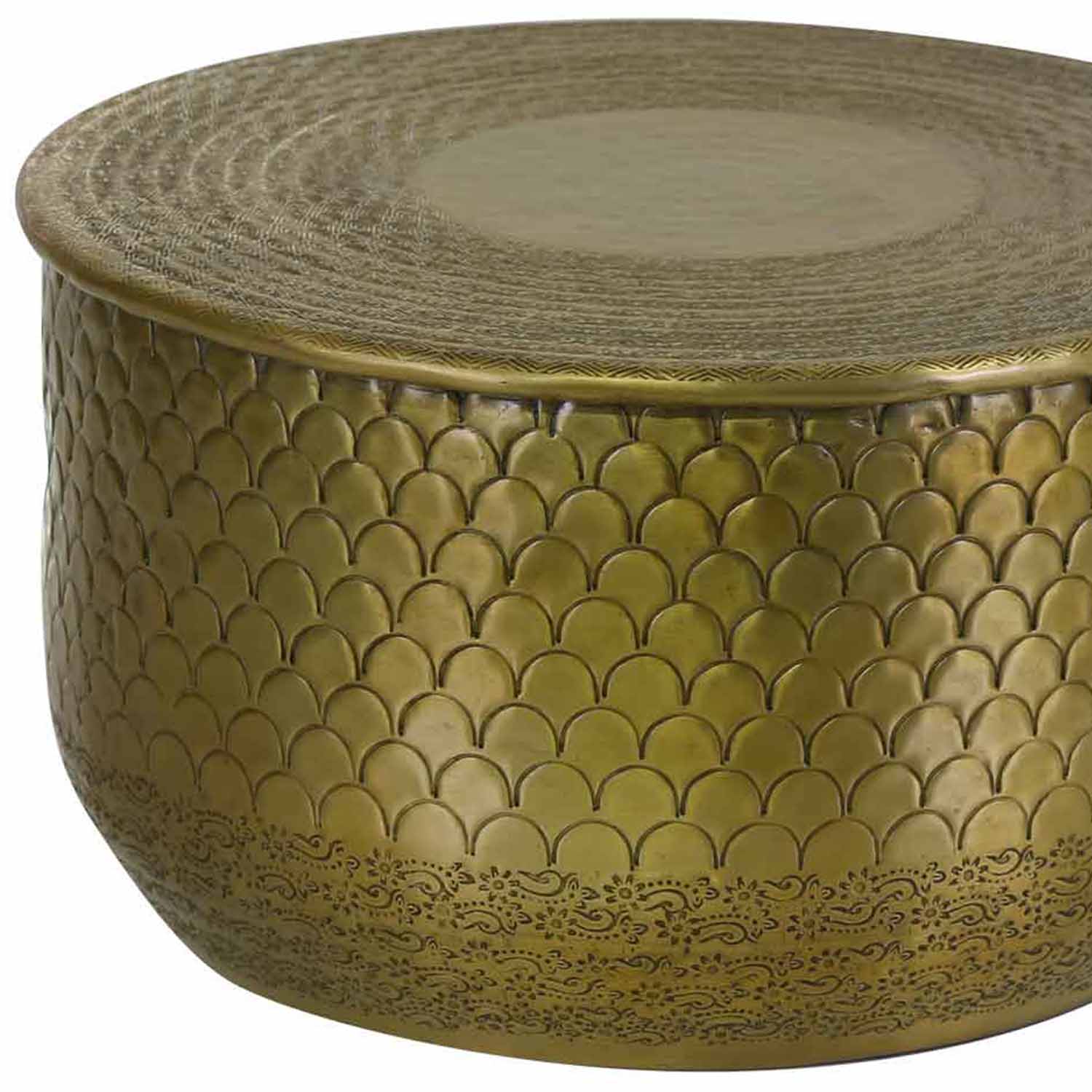 Ein sehr hochwertig verarbeiteter Beistelltisch Alava Gold aus Aluminium mit orientalischen Ornamenten verziert. Ein Möbelstück, dass man nicht jeden Tag zu sehen bekommt. Der orientalische Tisch mit Hammerschlag Optik macht sich besonders gut im Wohnzimmer als Couchtisch, oder als Ablagetisch im Arbeitszimmer oder als Shisha Tisch für Ihre Lounge. Das Dekoobjekt ist ein garantiertes Highlight und wird der Blickfang in jedem Raum sein. Er kann auch als Blumentisch, Teetisch, Nachttisch, Ablagetisch, Lampen- oder Telefonständer verwendet werden.