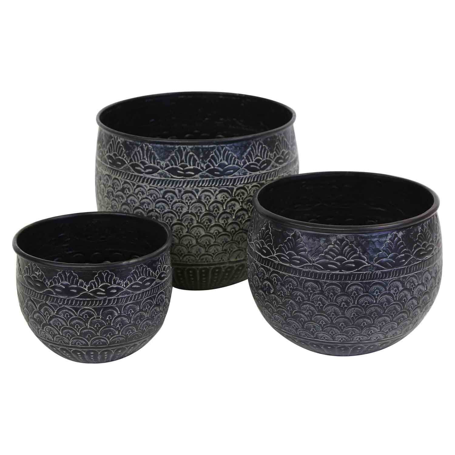 Unser Blumentopf „Murcia“ zeigt schon durch seine Ornamente, was er gerne aufnimmt. Denn was passt besser zu stilisierten Palmetten und Lotusblättern als Topfpflanzen? Diese Idee für das Muster stammt von orientalischen Kunsthandwerkern, die diese Übertöpfe in unserem Auftrag herstellen. Mit einem Hammer treiben sie das Ornament von innen aus dem geschwärzten Aluminium. Die anschließende Behandlung mit einer hellen Paste macht das Antik-Finish perfekt.