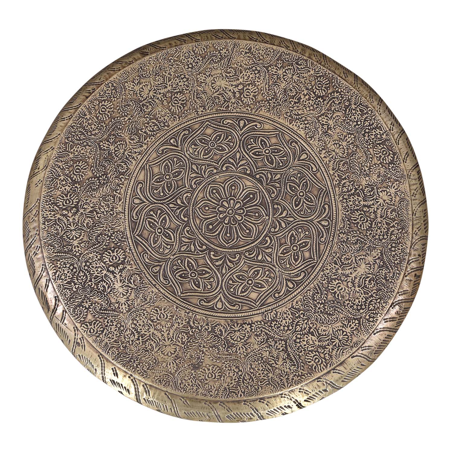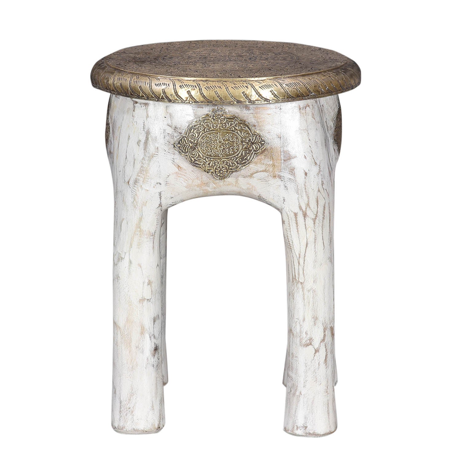 Stabiler Holzhocker aus Mangoholz mit verziertem Messing verkleidet. Dieser Holzhocker versetzt jeden Betrachter in eine andere Zeit und bereichert jedes Zimmer mit seiner Einzigartigkeit. Die filigranen Messingintarsien geben diesem edlen Sitzhocker ein unvergleichlich romantisches Erscheinungsbild.