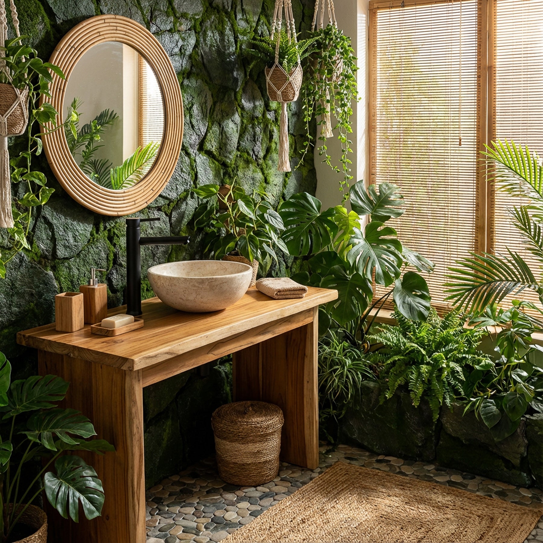 Rundes Aufsatzwaschbecken aus hellem Stein auf Holzwaschtisch mit schwarzer Armatur im grünen Spa-Badambiente