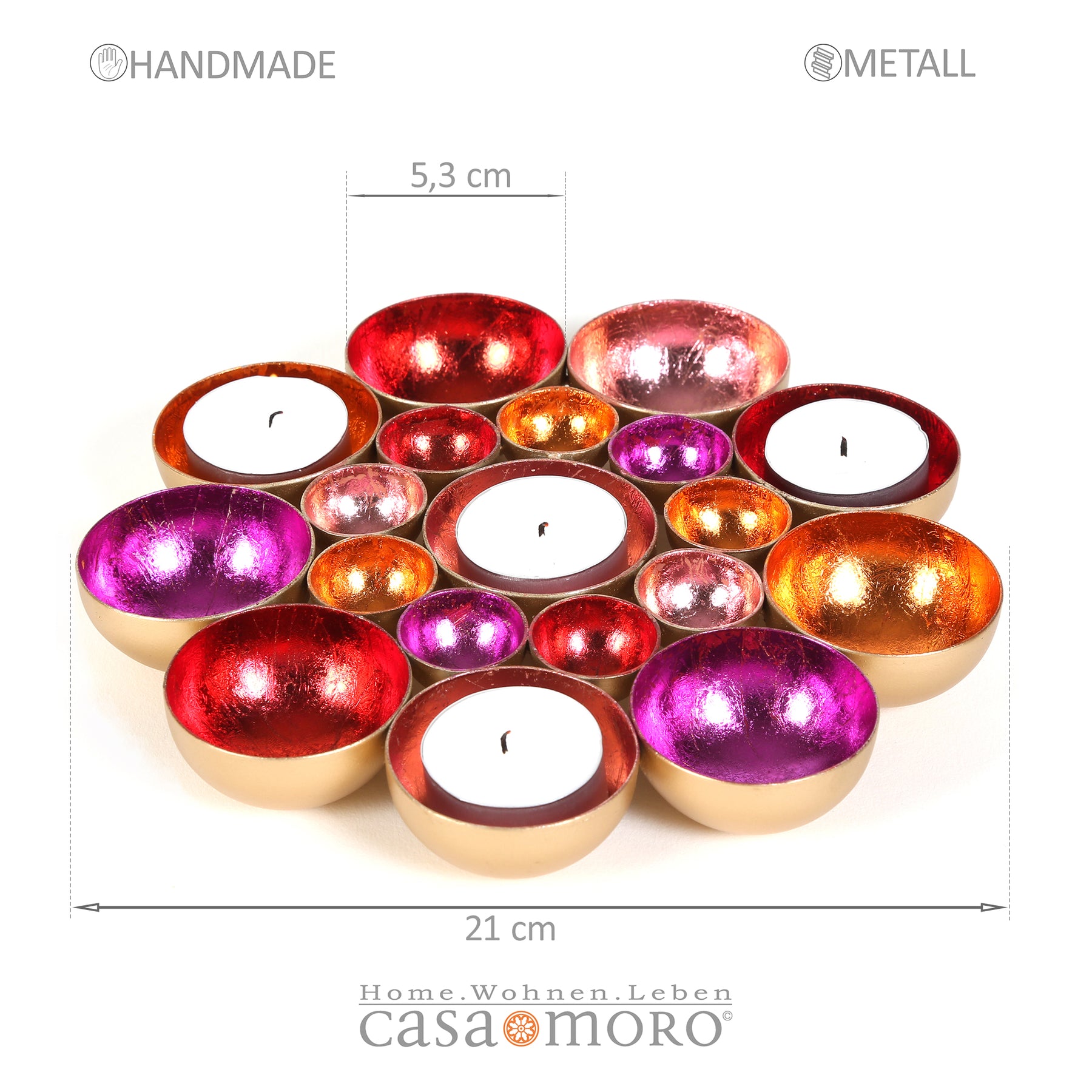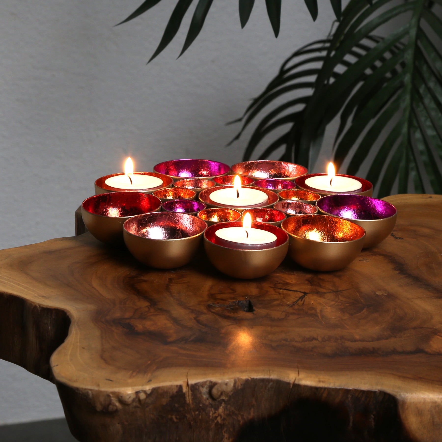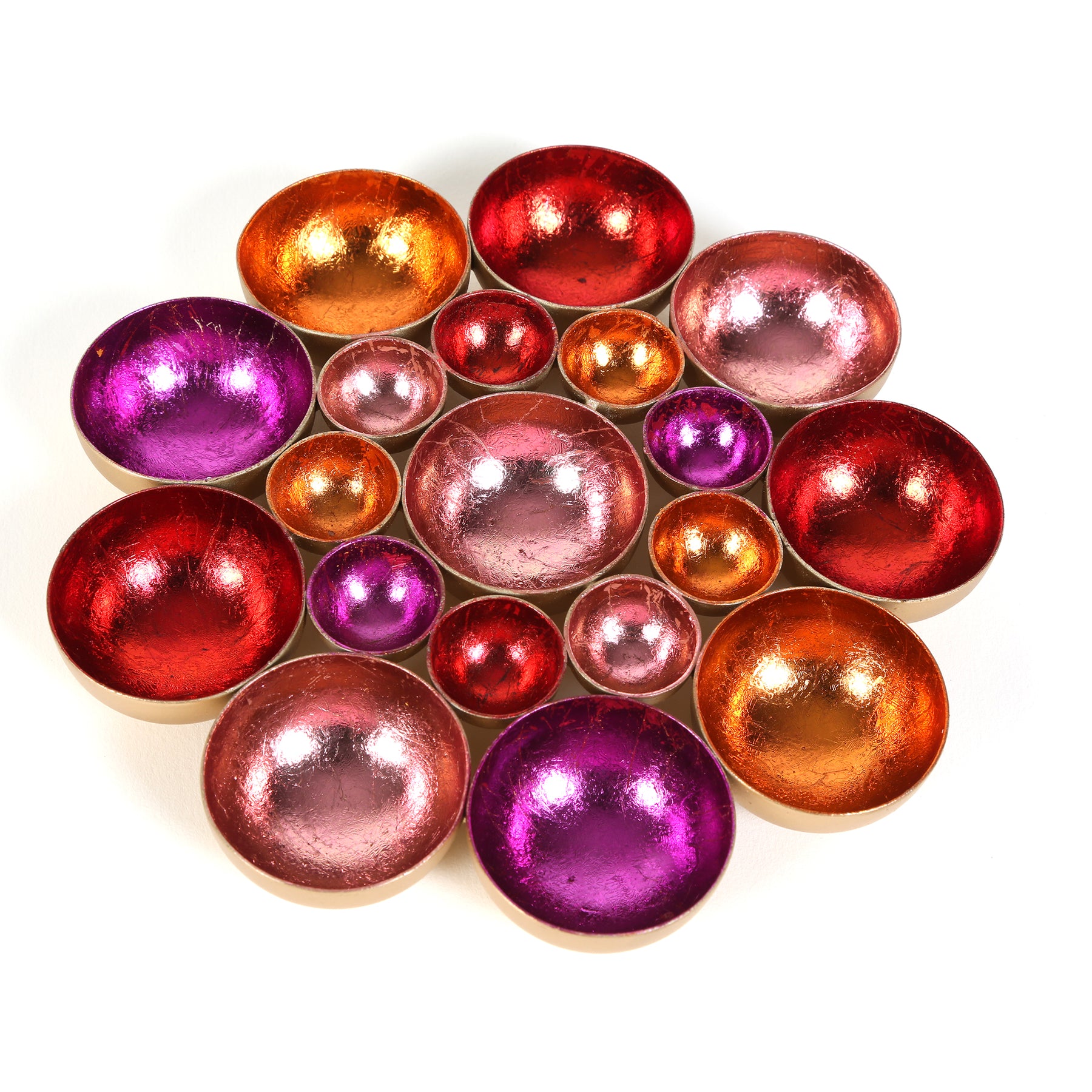 Blütenmeer aus Licht – Die handgefertigten Schalen in leuchtenden Farben sind zu einer wunderschönen Blume zusammengefügt und bringen eine einzigartige Lichtstimmung in dein Zuhause. Diese Dekoschale vereint kunstvolle Handarbeit und glamouröse Eleganz: Aus Metall gefertigt und innen in lebendigen Farben wie Gold, Rot, Pink, Rosa und Orange veredelt, reflektiert sie das Licht auf faszinierende Weise und schafft eine warme, einladende Atmosphäre.
