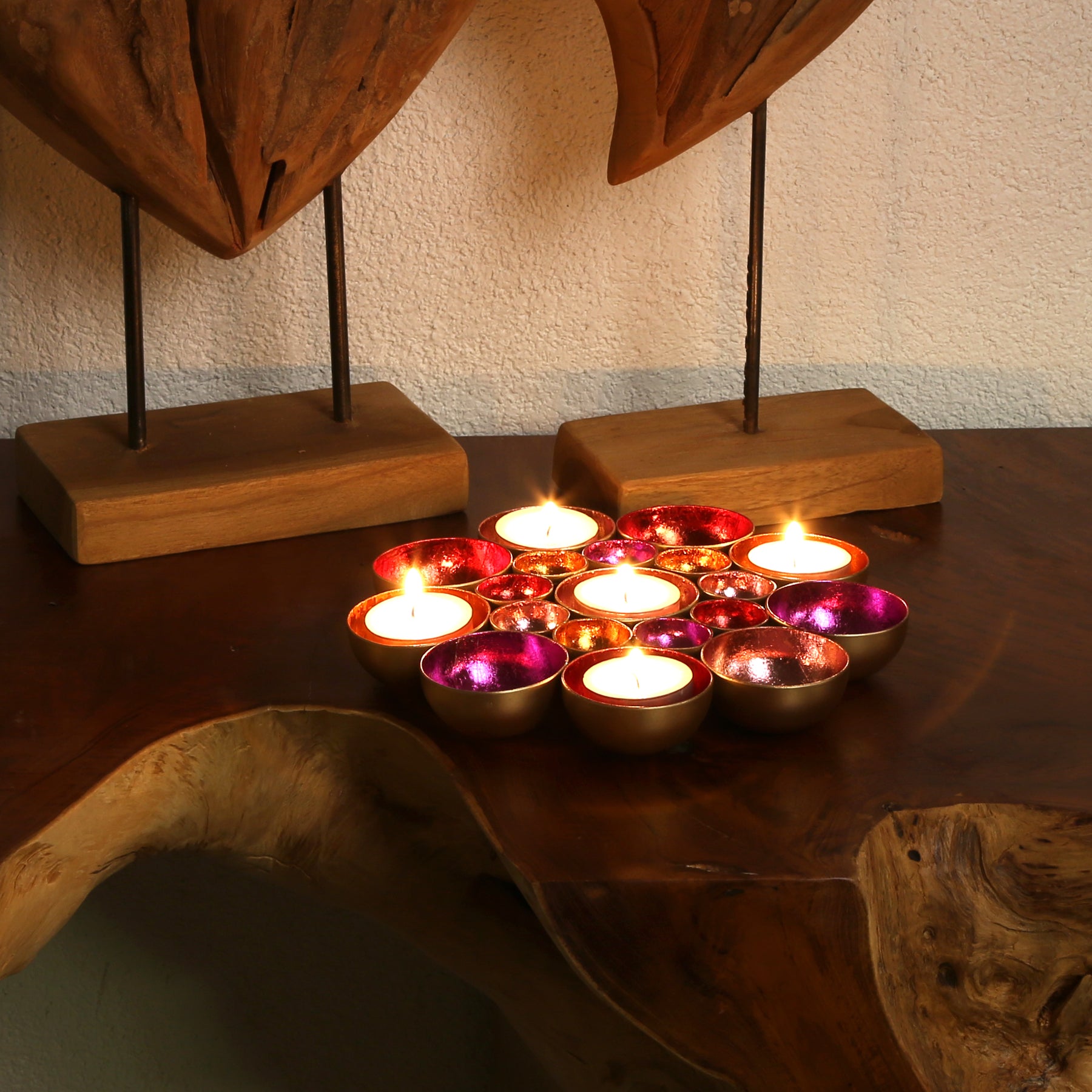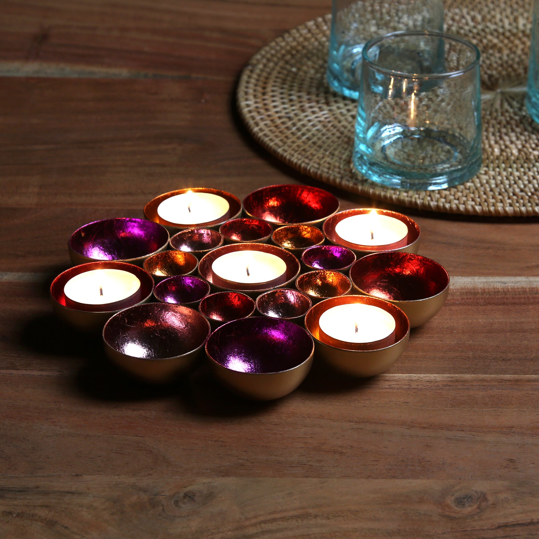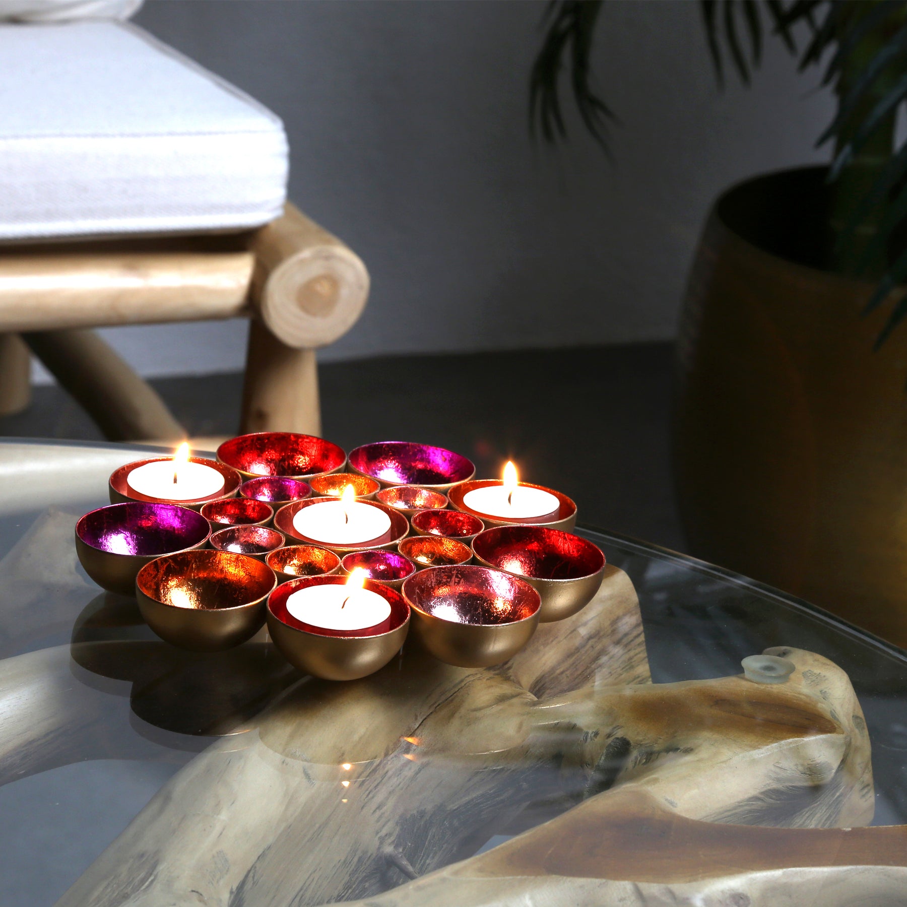 Blütenmeer aus Licht – Die handgefertigten Schalen in leuchtenden Farben sind zu einer wunderschönen Blume zusammengefügt und bringen eine einzigartige Lichtstimmung in dein Zuhause. Diese Dekoschale vereint kunstvolle Handarbeit und glamouröse Eleganz: Aus Metall gefertigt und innen in lebendigen Farben wie Gold, Rot, Pink, Rosa und Orange veredelt, reflektiert sie das Licht auf faszinierende Weise und schafft eine warme, einladende Atmosphäre.